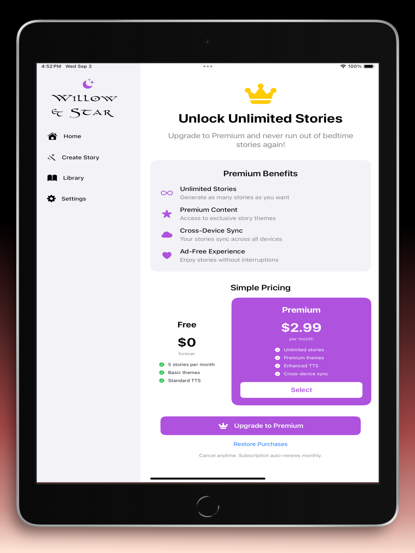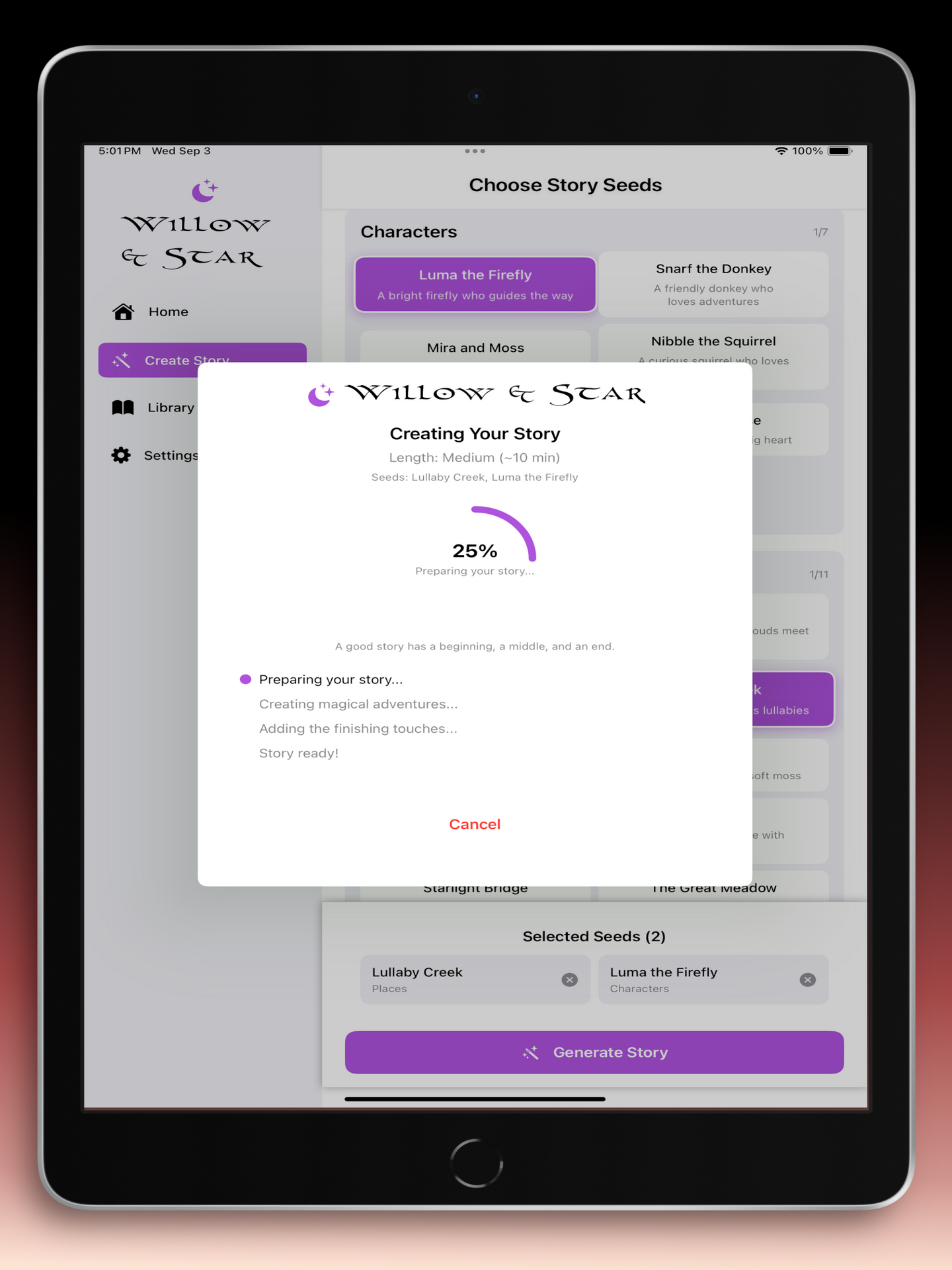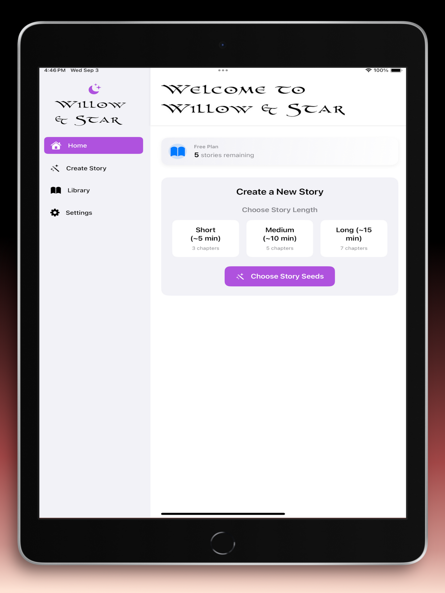 Your child’s ticket to a gentle, magical world, one bedtime story at a time. Designed for ages 3–9, this app creates calm, personalized tales using AI and your child’s favorite story “seeds”; choose a beloved character, a dreamy place, or a theme to spark their imagination. Tired? Voice strained? Willow and Star will read for you with text to speech technology. Developed for iPad and iPhone in landscape mode. Find out more below.